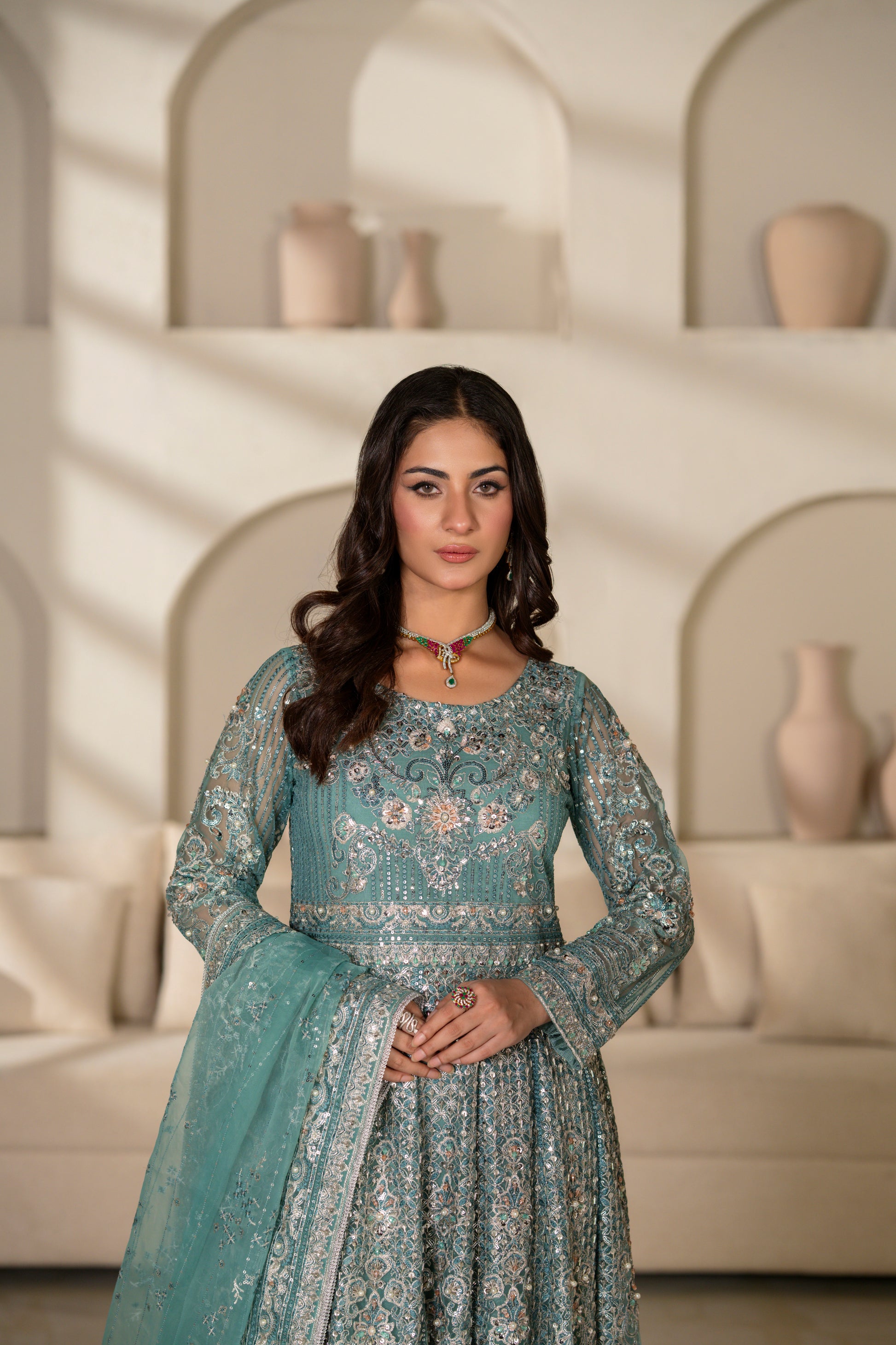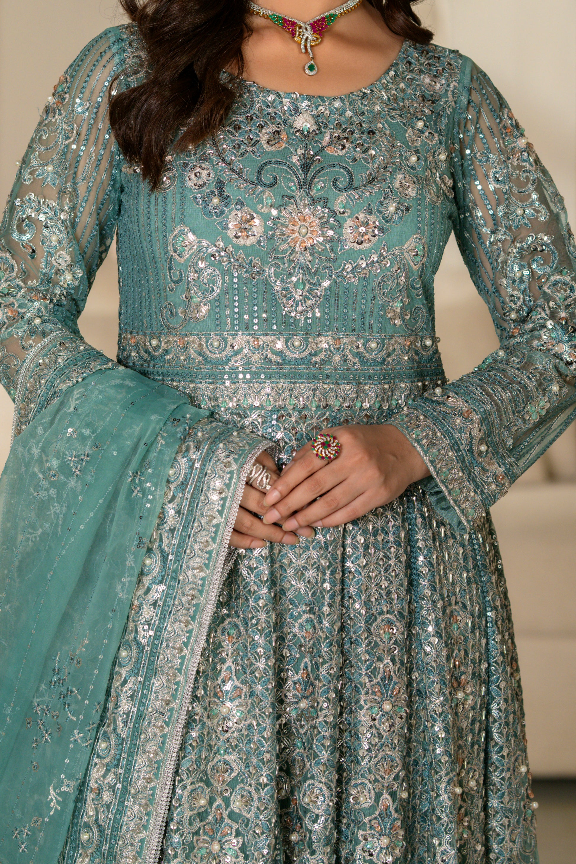 Embroidered Breeze Net with Hand Embellishment Sleeve